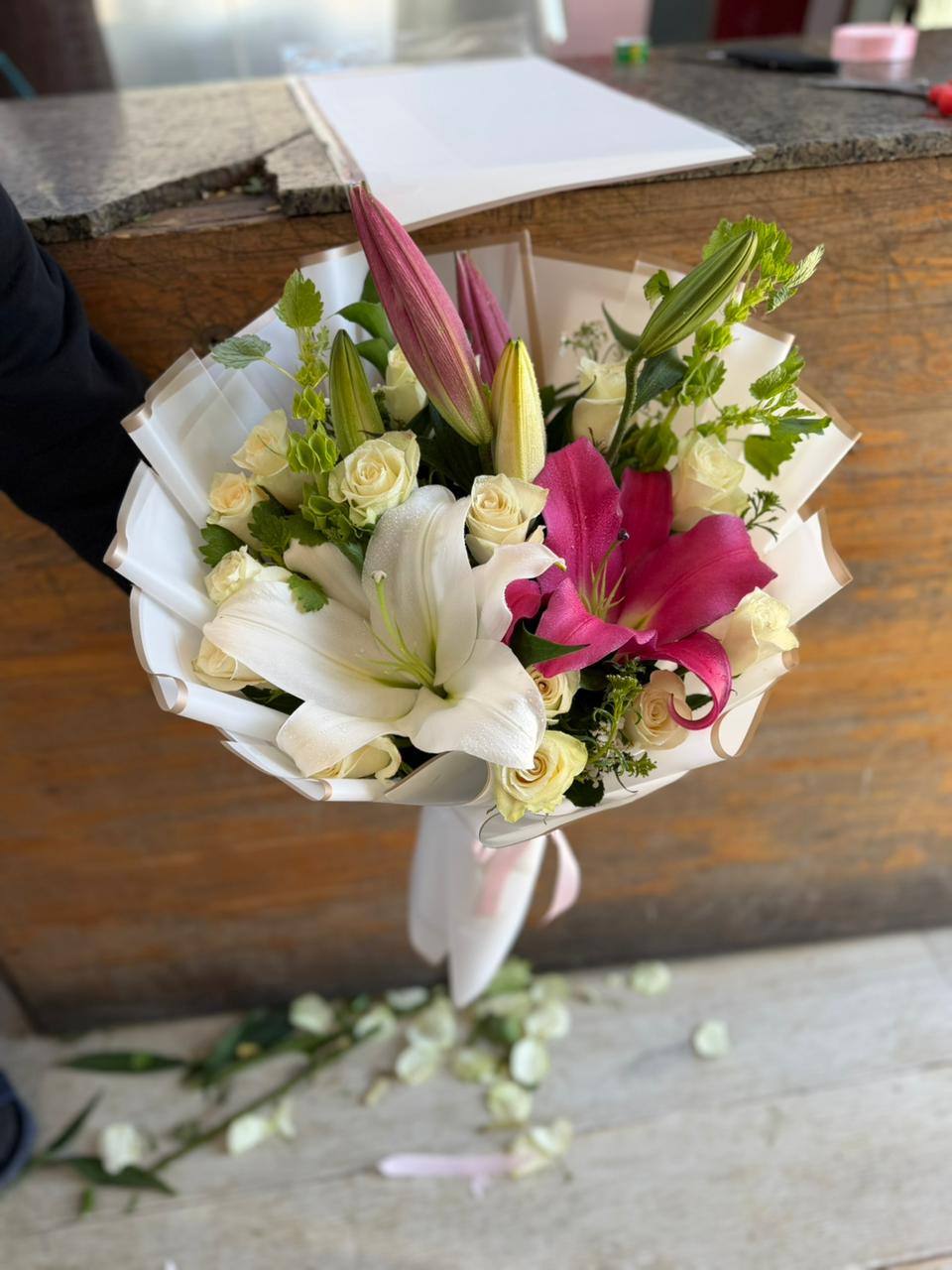 white and pink lilies hand buquet