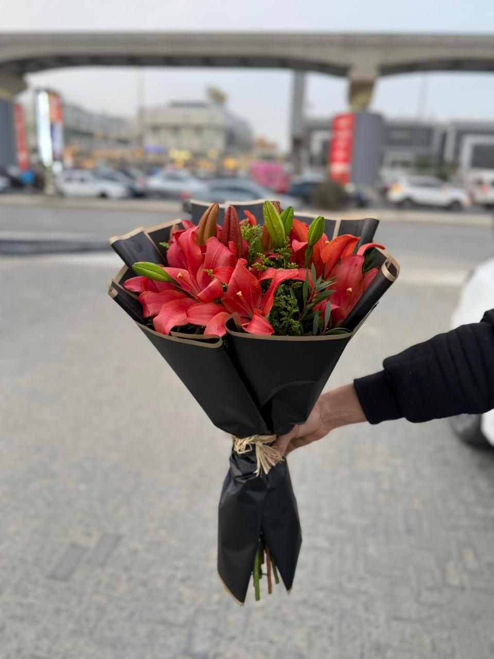 red lilies hand buquet