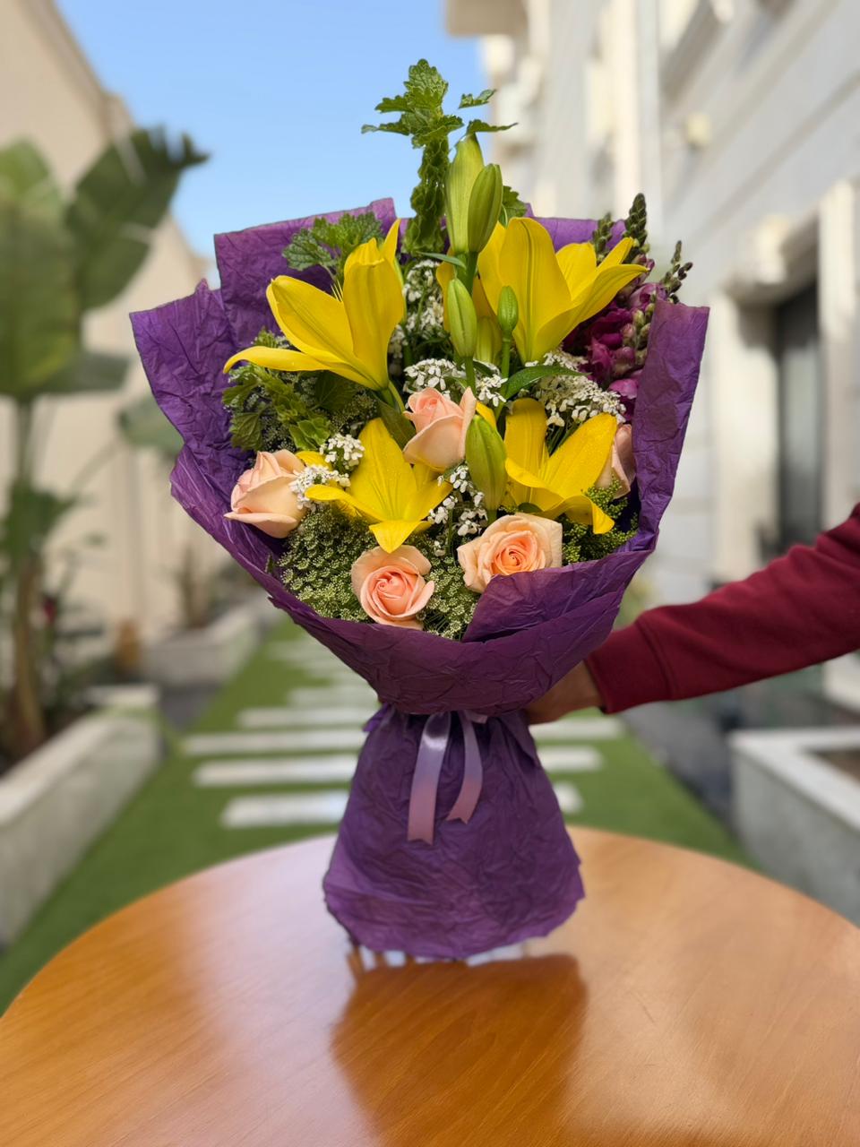 A beautiful arrangement of yellow lilies with flowers, perfect for cheerful gifts, birthdays, celebrations, and special occasions.